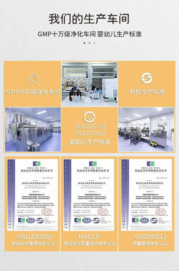 青岛然之味生物科技有限公司,成立于2020年5月,位于山东省青岛市即墨区段泊岚镇,拥有两个10万级GMP标准生产车间及标准化的食品化验实验室,公司引进国内最先进的技术及生产设备,生产工艺达到国内领先水平,是标准化、精细化生产、销售婴幼儿辅助健康食品的专业高科技企业。能生产几十种不同口味婴标或普通直面、花面、拌饭料和撒剂产品。主要产品包括婴幼儿面条,蝴蝶面以及海苔芝麻香味松(坚果类)。公司于2021年4月顺利通过婴幼儿谷类辅助食品(GB10769)和辅食营养补充品(GB22570)双认证。 2021年8月通过ISO9OO1质量管理体系、ISO2000食品安全管理体系、食品HACCP管理体系认证。