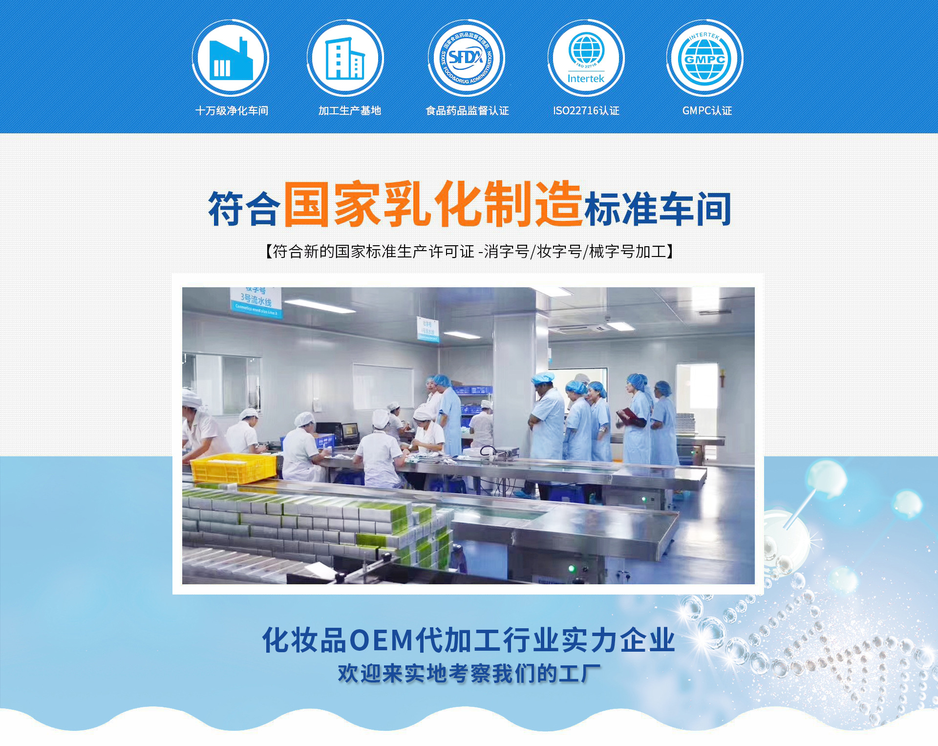 广州时尚美生物科技有限公司是一家集研发、生产为一体的专业化妆品企业,提供护肤品,化妆品原料,化妆品贴牌加工/OEM以及化妆品半成品和批发、代理等服务,拥有完整、科学的质量管理体系。一直秉承“让客户盈利才是我们最终的目的”的经营理念,不断倾听和满足用户的需求,因而始终处于高速发展的状态。公司厂区环境优美,厂房面积14000平方米,生产车间环境完全按照GMPC的标准来建设,拥有1200平方米的先进化实验室和10万级别灌装车间。公司目前拥有多条现代化的生产线,多台国际、国内先进乳化、灭菌、检验检测等仪器,具备各类膏霜、洗护、美容化妆产品的生产条件和能力,年生产量可达到数千万支,同时工厂不仅能生产各种形态、规格、品种的化妆品,还能实现化妆品所有常规项目的检测,全方位保证企业额产品质量。 科技打造品牌,品牌创造辉煌。面对新的挑战,广州时尚美生物科技有限公司将以全新的经营理念为指导,以高科技为手段,以先进设备为基础,以优良团队为支柱,精心打造化妆品行业品牌,这样的企业,成长是必要的,成功是必然的