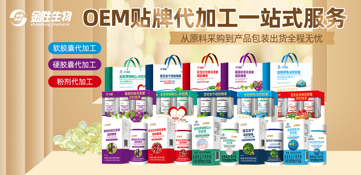 山东金胜生物科技有限公司,隶属于金胜集团,于2015年建厂,拥有先进的生产设备,多种类型包装生产线,专业的研发团队,配套有符合GMP要求的10万级的洁净车间。公司建有先进的提取、提纯、解析、浓缩、干燥生产线,以及进口大型软胶囊生产线、粉剂生产线、硬胶囊生产线、全自动数粒瓶装机、铝塑包装机等先进的生产设备,为您提供全方位一站式服务,为客户提供多元化、多品类产品服务方案,涵盖从原料提取、批文落户、标准制订、配方设计、贴牌定制、加工成品等一系列OEM代工服务。