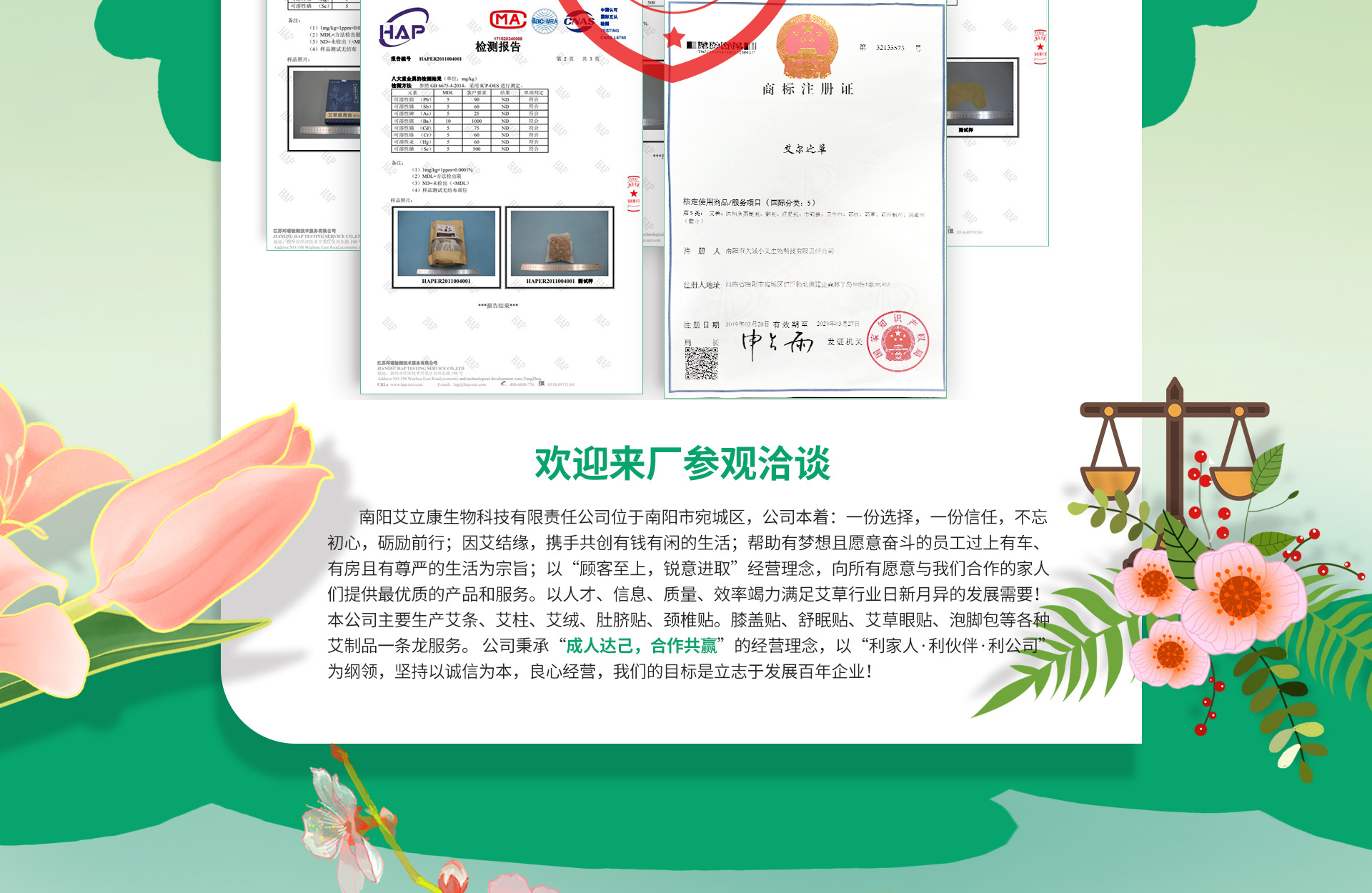 南阳艾立康生物科技有限责任公司位于南阳市宛城区,公司本着:一份选择,一份信任,不忘初心,砺励前行;因艾结缘,携手共创有钱有闲的生活;帮助有梦想且愿意奋斗的员工过上有车、有房且有尊严的生活为宗旨;以“顾客至上,锐意进取”经营理念,向所有愿意与我们合作的家人们提供最优质的产品和服务。以人才、信息、质量、效率竭力满足艾草行业日新月异的发展需要! 本公司主要生产艾草颈椎贴、老北京足贴、艾草肩周贴、腰椎贴、膝盖贴、艾草香皂、艾灸液、随身灸布套、泡脚丸、蒸汽眼罩、艾草暖灸贴、艾条、艾柱、艾草香膏、三伏贴蒲团、颈椎枕、除螨包、连体枕、暖足贴、暖腰贴、暖颈贴、艾绒、肚脐贴、舒眠贴、艾草眼贴、泡脚包等各种艾制品一条龙服务。 公司秉承“成人达己,合作共赢”的经营理念,以“利家人·利伙伴·利公司”为纲领,坚持“一帮二教三赋能”的服务宗旨,一直引领在艾草行业的前沿!